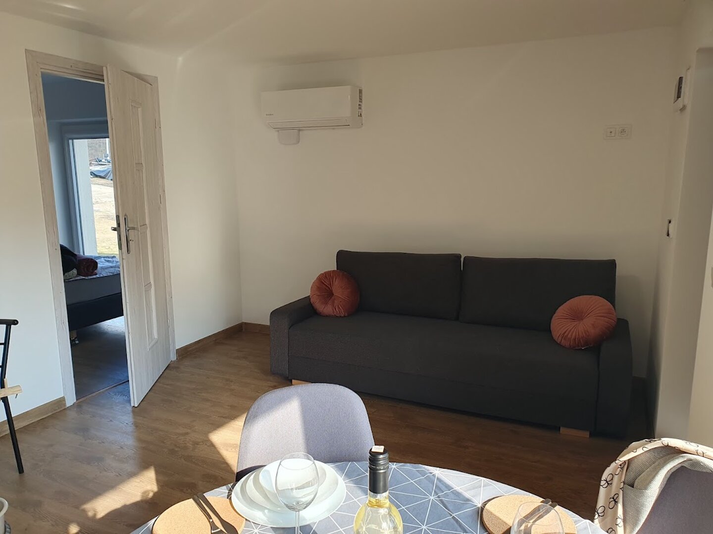 Apartament, sypialnia, łazienka, salon z rozkładana sofą i aneksem kuchennym, taras